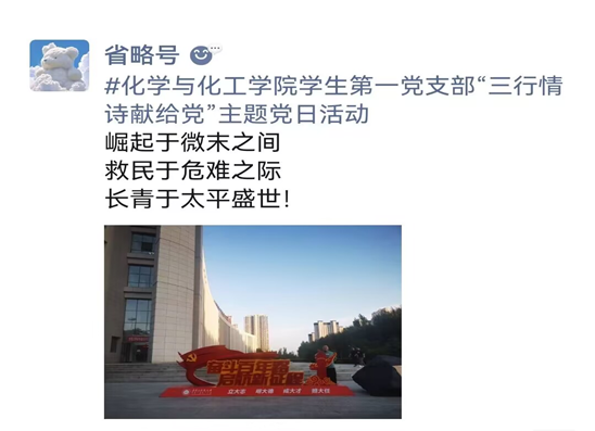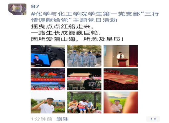 2023年是中国共产党成立102周年。一百年多年前,中国共产党的先驱们创建了中国共产党,形成了坚持真理、坚守理想,践行初心、担当使命,不怕牺牲、英勇斗争,对党忠诚、不负人民的伟大建党精神。全体党员和积极分子结合伟大建党精神及自身发展书写情诗,通过打卡本人与红色遗迹、会馆及校园红色文化宣传标识的合影歌颂伟大祖国。