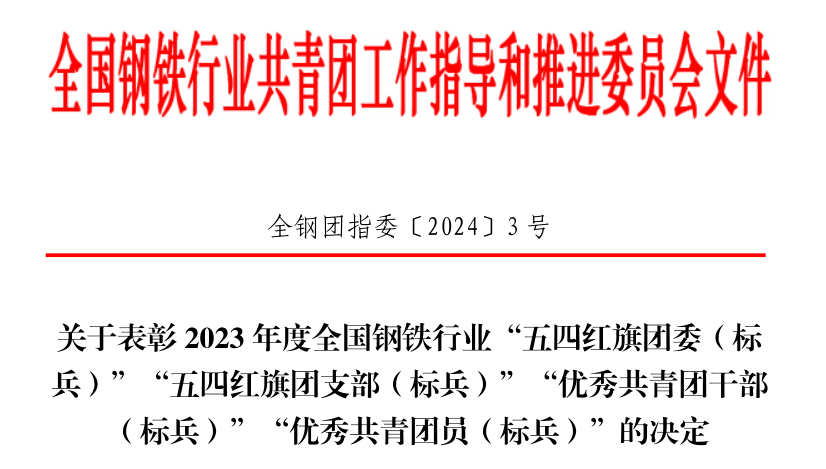 全国钢铁行业共青团工作指导和推进委员会下发了《关于表彰2023年度全国钢铁行业“五四红旗团委(标兵)”“五四红旗团支部(标兵)”“优秀共青团干部(标兵)”“优秀共青团员(标兵)”的决定》,yl6776永利集团团总支被授予“全国钢铁行业‘五四红旗团支部’”荣誉称号。
