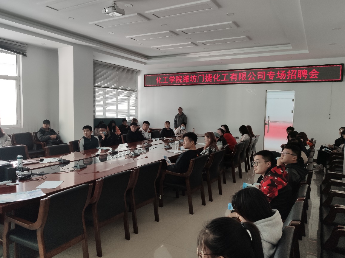潍坊门捷化工有限公司前身为衢州门捷化工有限公司,公司成立于1993年,拥有固定资产1.2亿元,现有员工150余名。公司此次收到学院邀请,来校召开专场招聘会,招聘机电、化工、工程类相关专业40人。宣讲会上公司人事部经理通过企业宣传片及PPT介绍公司基本情况,并回答同学们关心的问题,收取简历后现场进行面试。