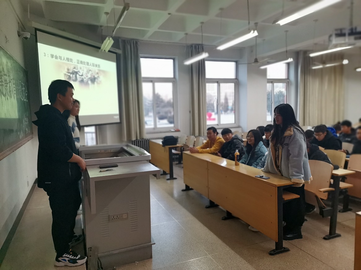 各班级主题班会由心理委员主持。班会围绕“如何管理自己的情绪”、“如何解决学习中的困惑,提高学习兴趣”、“学会与人相处,正确处理人际关系”、“如何规划我的大学生活”等内容展开。各班心理委员为同学们讲解心理健康知识,同学们积极配合、踊跃发言、进行游戏互动等,许多班级邀请到了本班副班主任在会上进行发言,最后由心理委员对本次班会进行总结。