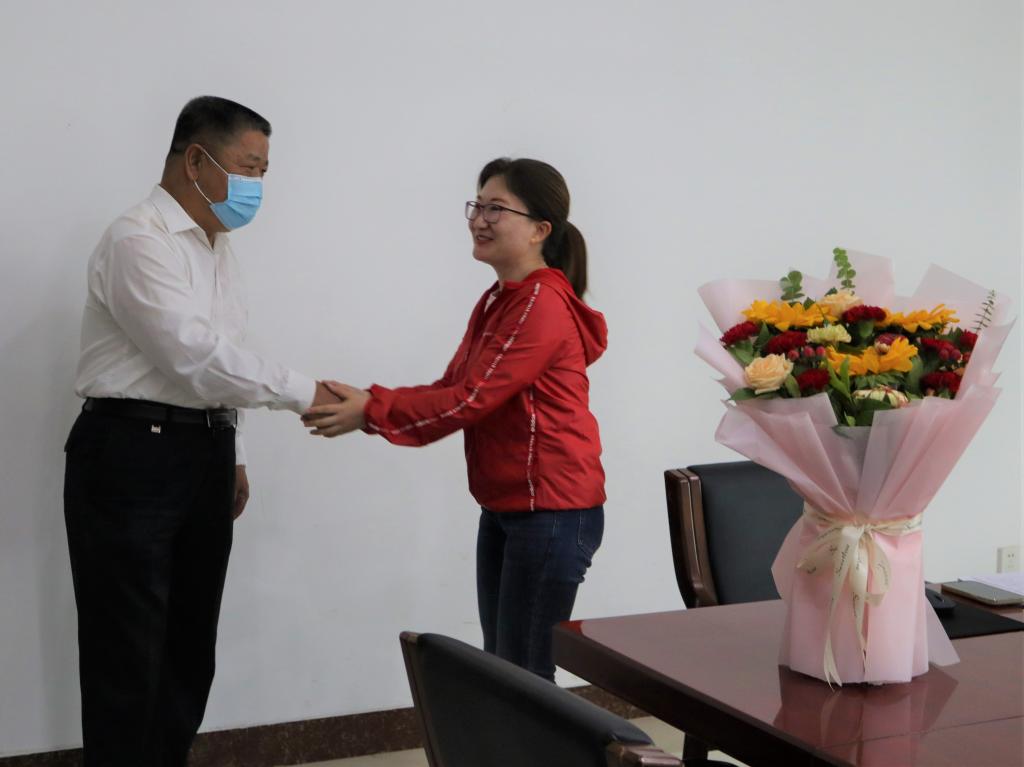 随后冯书记慰问学院辅导员、学工办主任冀虹。冯书记说:“冀虹入职十多年,一直从事辅导员工作,工作扎实认真,是辅导员队伍中的优秀代表。特别是在疫情防控期间,面临学生返校的巨大压力,全校辅导员队伍冲锋在前,日日夜夜守护在疫情防控一线,值此教师节来临之际,我代表校党委来慰问你,也是对整个辅导员队伍的辛勤付出表示感谢!”
