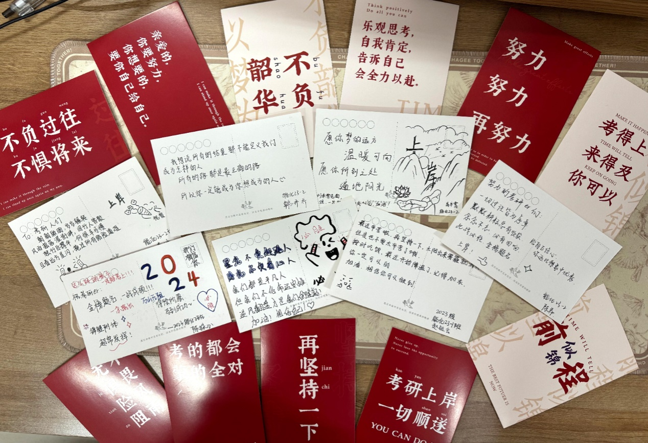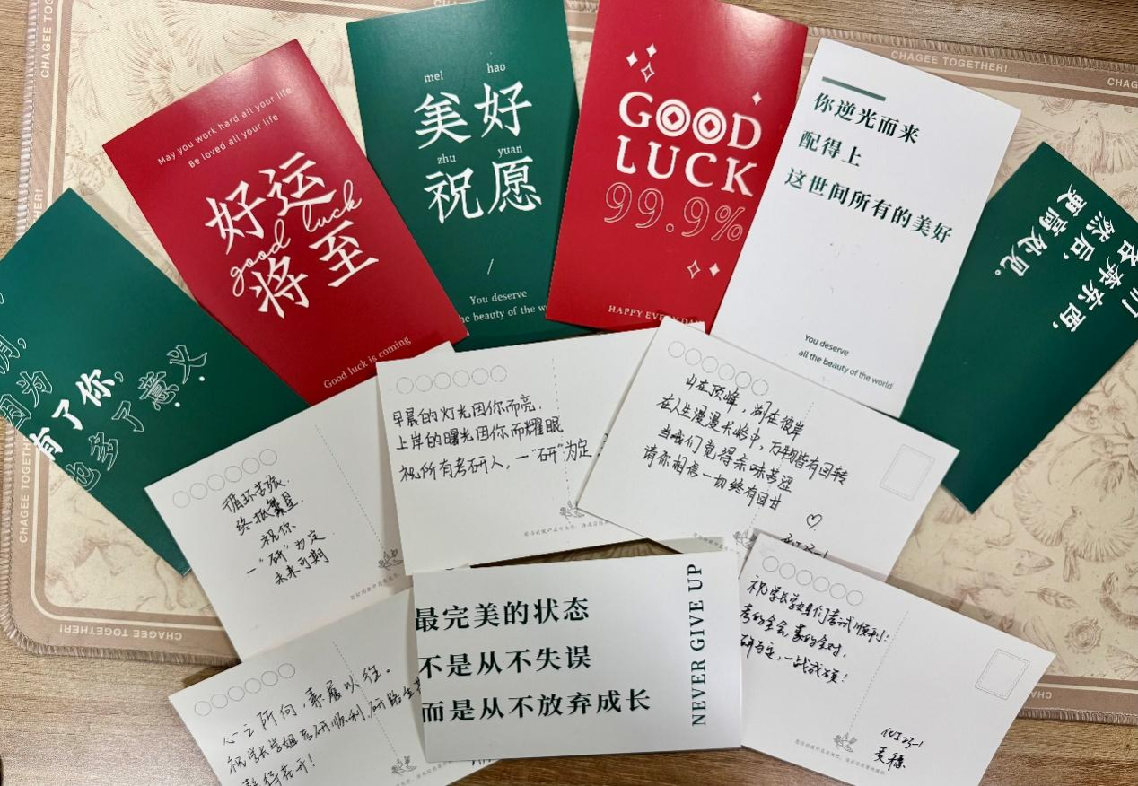 活动最后,学院为每位考研学子送去了寓意美好的礼物及来自老师和学弟学妹的祝福卡片,表达了学院的关怀和同学们的美好祝愿,增强了同学们备考的信心和动力。