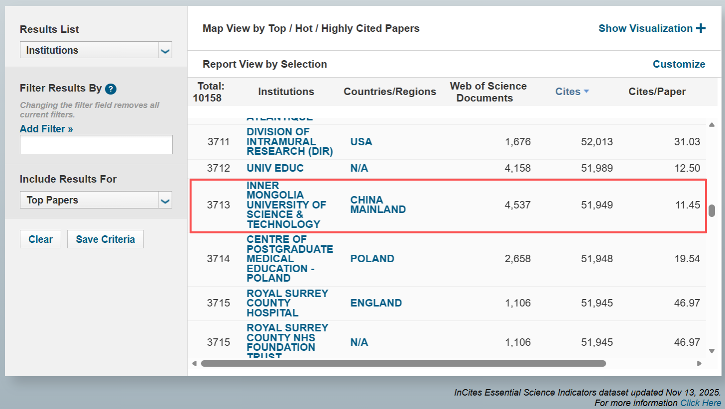 ESI数据库共分22个学科领域,是基于科睿唯安Web of Science(SCIE/SSCI)所收录的全球12000多种学术期刊的1000多万条文献记录而建立的计量分析数据库。以10年为1个周期对全球所有大学及科研机构的SCI、SSCI论文及其引用情况等进行统计和比较,按论文被引次数排列在前1%的学科方可进入ESI学科排行,同时给出排名进入全球前1%的大学及科研机构的排序,每2个月更新公布1次。ESI数据库通过论文数、论文被引频次、论文篇均被引频次、高被引论文、热点论文和前沿论文等6大指标,从各个角度对国家/地区科研水平、机构学术声誉、科学家学术影响力以及期刊学术水平进行全面衡量,已成为当今世界范围内普遍用以评价高校、学术机构、国家/地区国际学术水平及影响力的重要评价指标工具之一。