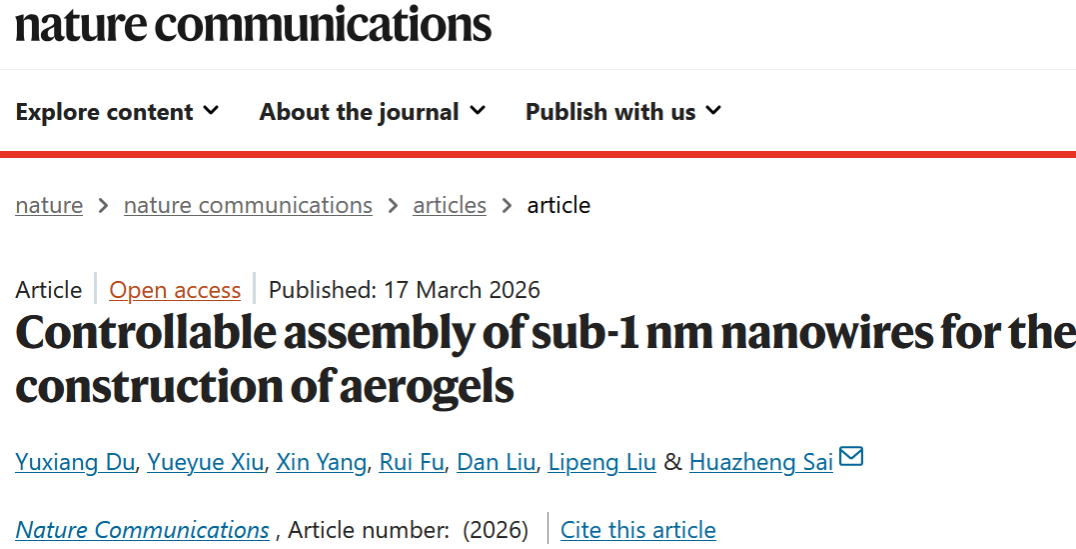 近日,我院赛华征教授团队在稀土基亚纳米线气凝胶可控构筑领域取得新突破,相关成果“Controllable assembly of sub-1 nm nanowires for the construction of aerogels”发表于综合性国际顶级期刊《Nature Communications》(DOI: 10.1038/s41467-026-70713-8)。赛华征教授为论文的独立通讯作者,硕士研究生杜玉祥为论文第一作者,永利官网为唯一完成单位。